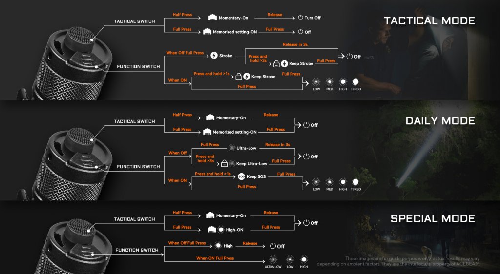 Med dubbla taktiska strömbrytare får användaren omedelbar åtkomst till momentary Turbo och Strobe. P16 2.0 har tre separerade användarlägen – Tactical Mode, Daily Mode och Special Mode – vilket ger en flexibilitet för både stressade situationer.