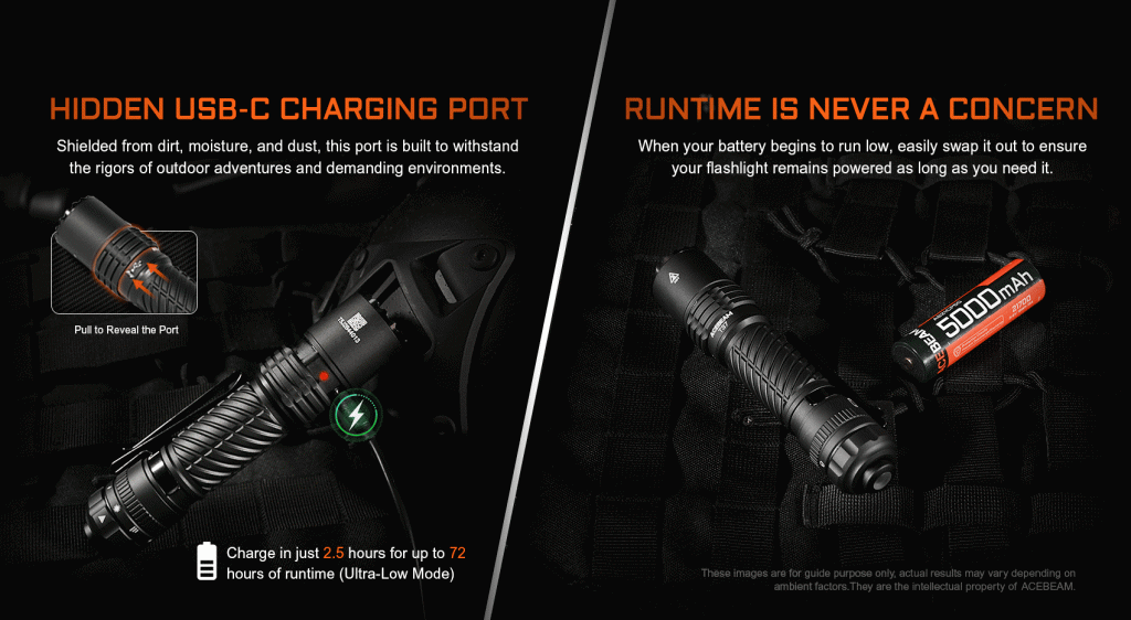 T37 drivs av ett högkapacitets 21700 Li‑ion‑batteri på 5000 mAh och laddas smidigt via en dold USB‑C‑port. Lampan är byggd för professionellt bruk med IP68‑klassning, kraftig konstruktion och lång drifttid – upp till 72 timmar i Ultra‑Low‑läge.